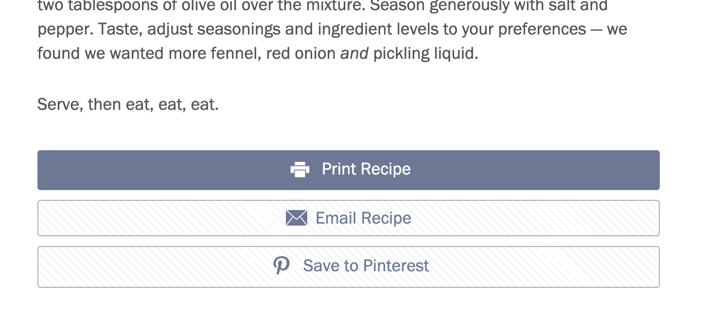 I hate that your website is not set up with a link to PRINT the recipes. Most have this option but not Smitten Kitchen. I am an ‘oldie’ and like a hard copy for my cooking.