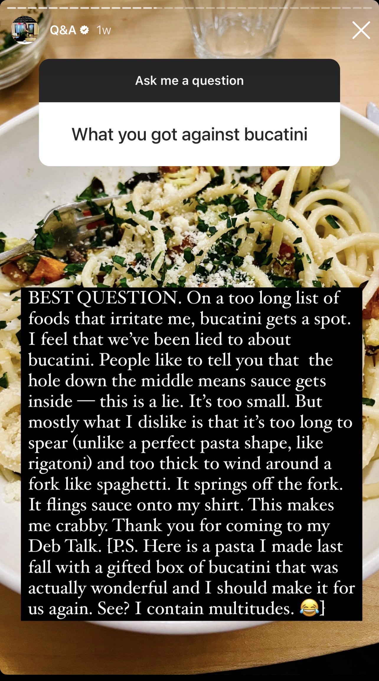 Ha! I feel so vindicated in my irritation with bucatini! For all the reasons you described-sometimes the internet is a confirming place, thank you!