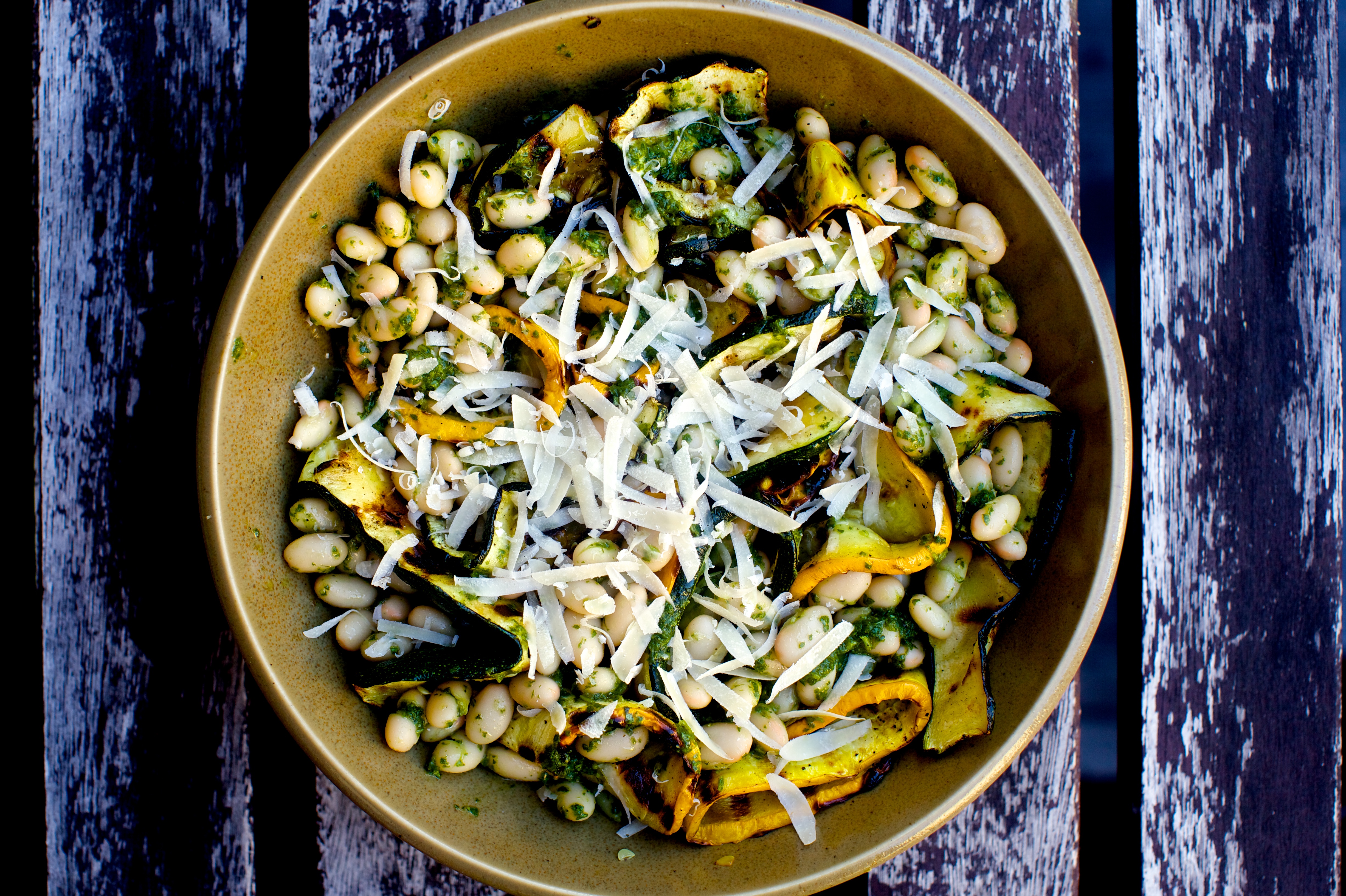 grilled zucchini ribbons with pesto and white beans