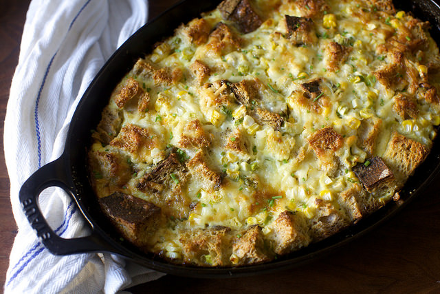 corn, cheddar and scallion strata